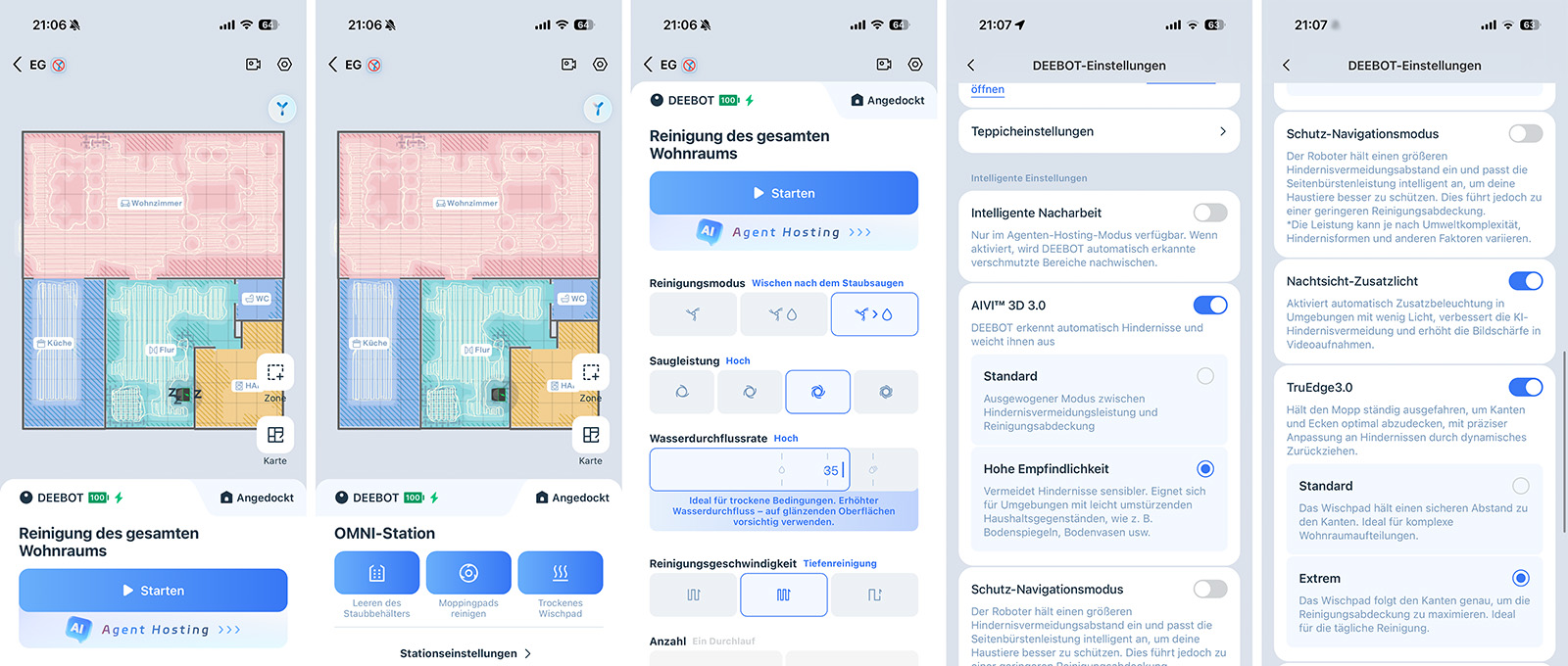 Über die erweiterten Einstellungen (Zahnrad-Symbol) kommt man zu einer Wartungsübersicht, den DEEBOT-Einstellungen und Stationseinstellungen. Hier kann man wirklich noch sehr viel konfigurieren.