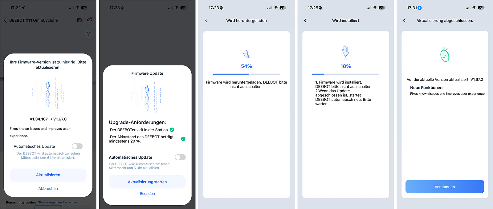 Direkt nach der Einrichtung gibt es meist ein Firmware-Update. Das ist ein gutes Zeichen, bedeutet es doch, dass ECOVACS aktiv an Verbesserungen arbeitet.