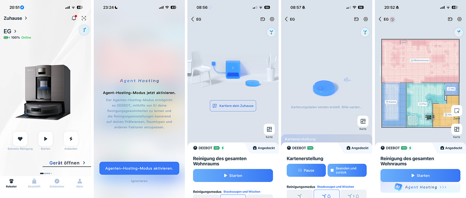 In der Kartenansicht gibt es den „Starten“-Button. Zusätzlich kann man Bereichsreinigungen starten oder einzelne Räume auswählen. Neben den klassischen Reinigungseinstellungen bietet der X11 OMNICYCLONE den Modus „Agent Hosting“. Das ist im Grunde der KI-Autopilot des Saugroboters. Anstatt mühsam für jeden Raum die Saugstufe, die Wasserdurchflussmenge oder die Anzahl der Durchläufe manuell zu definieren, überlässt man dem Roboter die Entscheidung. Der X11 lernt aus euren bisherigen Einstellungen und generiert anhand der Raumerkennung und des Bodentyps automatisch die passenden Reinigungsparameter.