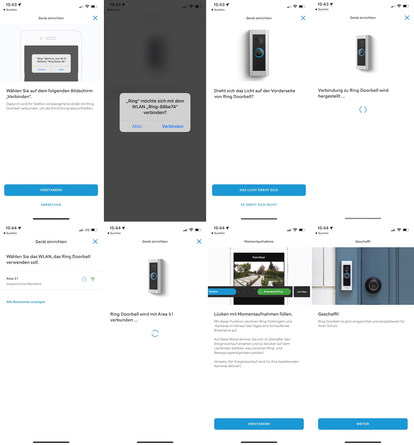 Durch den Barcode, welchen wir zu Beginn der Einrichtung gescannt haben, weiß die App wie das temporäre WLAN der Türklingel heißen muss und will sich direkt mit diesem verbinden. Findet die App nun die Türklingel, werden die WLANs in der Nähe angezeigt. Man wählt sein Haus-WLAN aus und gibt sein WLAN-Kennwort ein. Die Video Doorbell Pro 2 verbindet sich nun mit dem WLAN und stellt danach die Funktion „Momentaufnahmen“ vor: