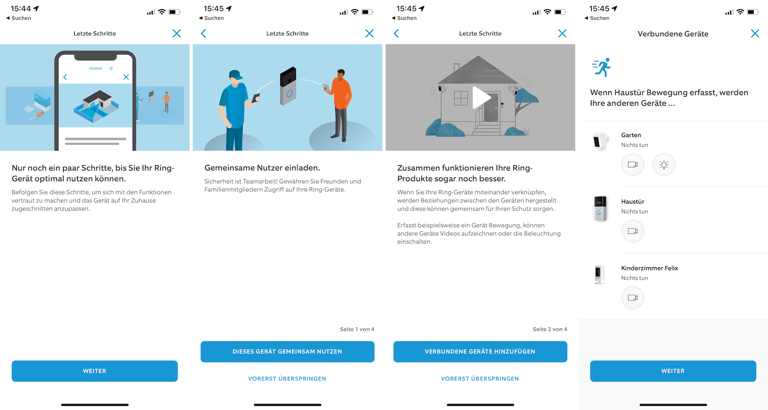 Zu Beginn, nach der Sichtung des Lieferumfangs, sollte man sich die Ring App (iOS / Android) auf dem Smartphone installieren. Gegebenenfalls muss man sich noch ein Ring-Konto anlegen. Um mit dem ausführlich und gut erklärtem Einrichtungsprozess zu beginnen, scannt man, im Menü „Geräte“ > „Gerät einrichten“, den Barcode auf der Türklingel.